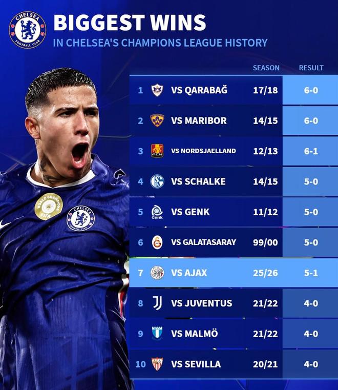 5-1战胜阿贾克斯,切尔西赢得队史欧冠单场第7大比分胜利